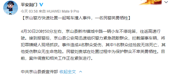 據(jù)@平安荊門 通報,4月30日,湖北京山警方在快速處置一起駕車撞人事件過程中,民警劉貴斌在處置過程中為保護群眾犧牲。