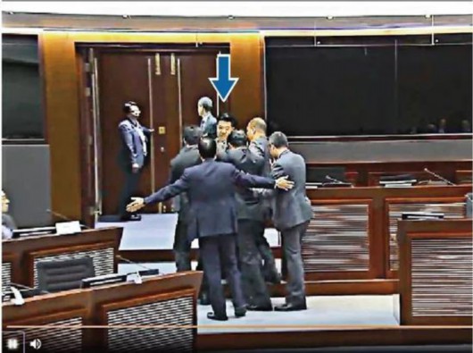 范國威被保安驅(qū)逐離開會議廳,其間一度推撞保安員至雙雙倒地 /電視截圖